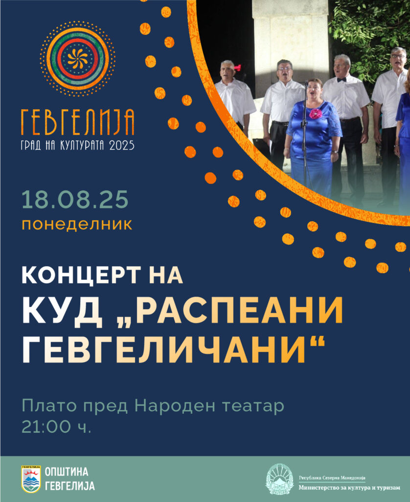 Програмата за август, во рамки на манифестацијата „Гевгелија град на култура за 2025 година“, продолжува со Концерт на староградска песна и музика на Културно-уметничкото друштво „Распеани гевгеличани“, кој ќе се одржи денес (18 август 2025 година), со почеток во 21:00 часот, на платото пред Народен театар- Гевгелија.