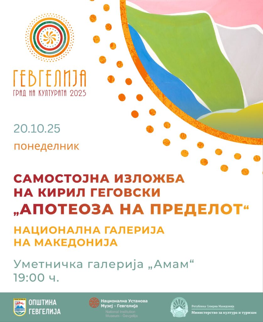 Во рамките на програмата за „Гевгелија град на културата за 2025 година“, на 20 октомври (понеделник), со почеток во 19:00 часот, во Уметничката галерија „Амам“ ќе биде отворена самостојна Изложба на реномираниот ликовен уметник Кирил Гегоски, насловена „Апотеоза на пределот“, во организација на ЈОУ Дом на култура „Македонија“- Гевгелија во соработка со НУ Национална галерија на Македонија и НУ Музеј- Гевгелија.