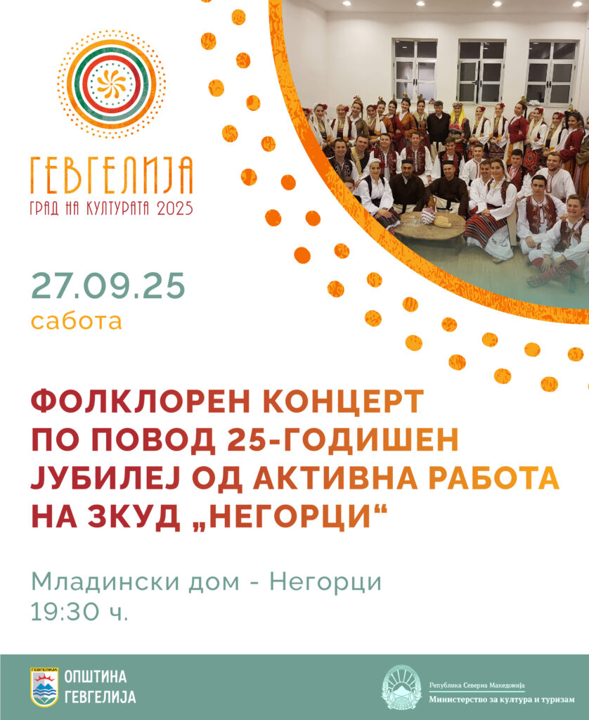 На 27 септември 2025 година (сабота), со почеток во 19:30 часот, во Младинскиот дом во Негорци, ЗКУД „Негорци“ Фолклорен концерт ќе го одбележи својот 25-годишен јубилеј од активната работа. На свечениот настан, покрај изведба на традиционални песни и игри од репертоарот на ЗКУД „Негорци“, ќе бидат истакнати и постигнатите успеси на Ансамблот, коишто ја потврдуваат посветеноста кон зачувување и промоција на традиционалната култура.