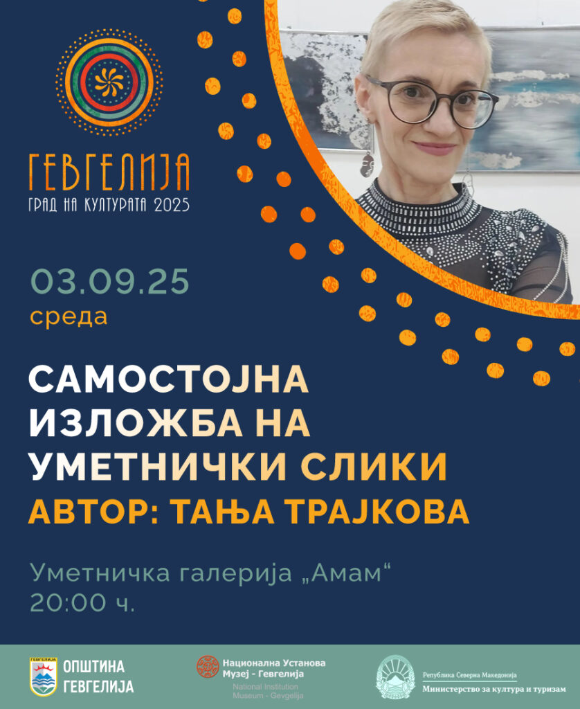 Во рамки на манифестацијата „Гевгелија град на културата за 2025 година“, на 3 септември 2025 година (среда), со почеток во 20:00 часот, во Уметничката галерија „Амам“ ќе биде отворена четвртата самостојна Изложба на уметнички слики од Тања Трајкова од Гевгелија, насловена „Имагинација“.
