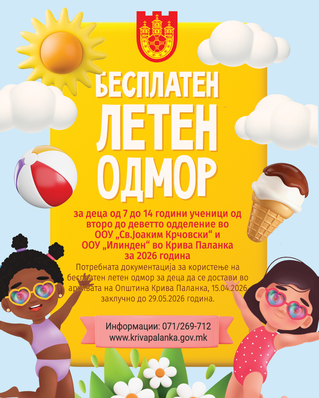 Општина Крива Паланка објавува јавен повик за бесплатно летување на деца од 7 до 14 години. Оваа иницијатива е дел од Програмата за социјална, детска и здравствена заштита за 2026 година, која има за цел да обезбеди квалитетно време за најмладите во нашата општина.
