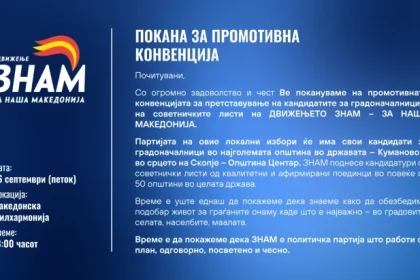 ЗНАМ вечерва ја одржува конвенцијата – ќе ги претстави кандидатите за градоначалници и советници