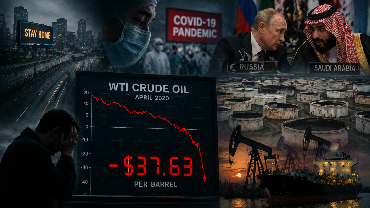 Во исто време, Русија и Саудиска Арабија влегоа во ценовна војна. Наместо да го намалат производството, тие го зголемија, обидувајќи се да освојат поголем дел од пазарот. Ова создаде огромен вишок на нафта што немаше каде да се складира.