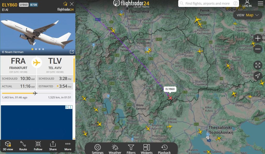 Карго авион со ознаки 4X-EKZ предмалку го напушти македонскиот воздушен прост и продолжи да лета кон Израел. Се работи за карго авион кој полетал во 11:16 часот по локално време од Франкфурт, а се очекува да слета во Тел Авив во 15:54 часот по локално време. Карго авионот е од марката Boeing 737-86N(BCF) и засега не е познато што превезува и претставува првиот директен лет од Германија кон Израел од почетокот на нападот кон Иран пред неколку денови.