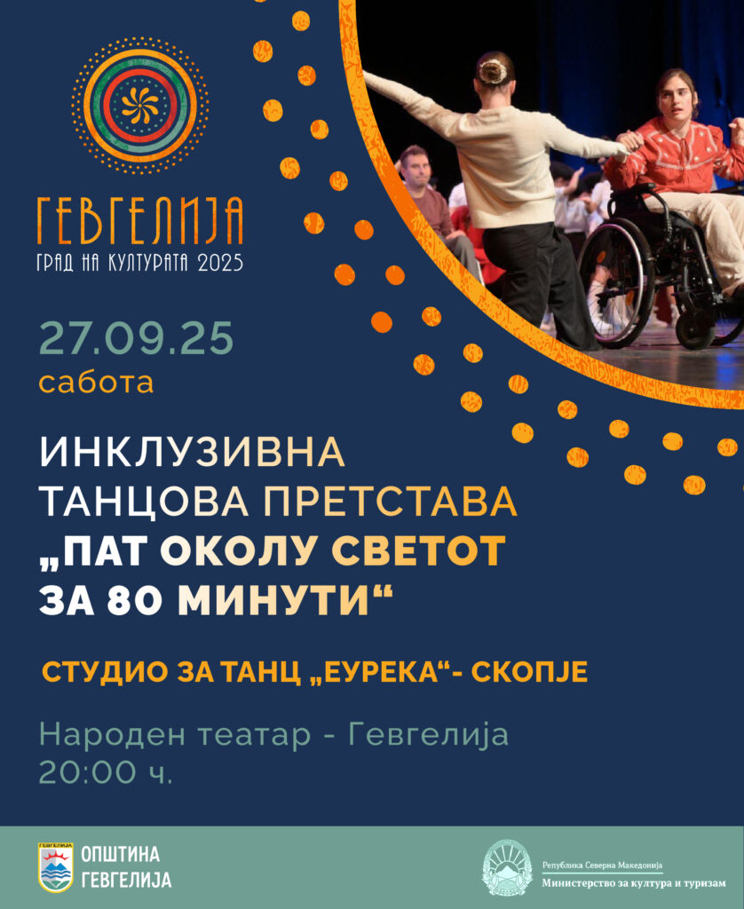 Во рамки на грограмата „Гевгелија град на култура за 2025“, на 27 септември 2025 година (сабота), со почеток во 20:00 часот, на сцената на Народниот театар во Гевгелија, јавноста ќе има можност да ја проследи Инклузивната танцова претстава „Пат околу светот за 80 минути“ во изведба на Студиото за танц „Еурека“ од Скопје.