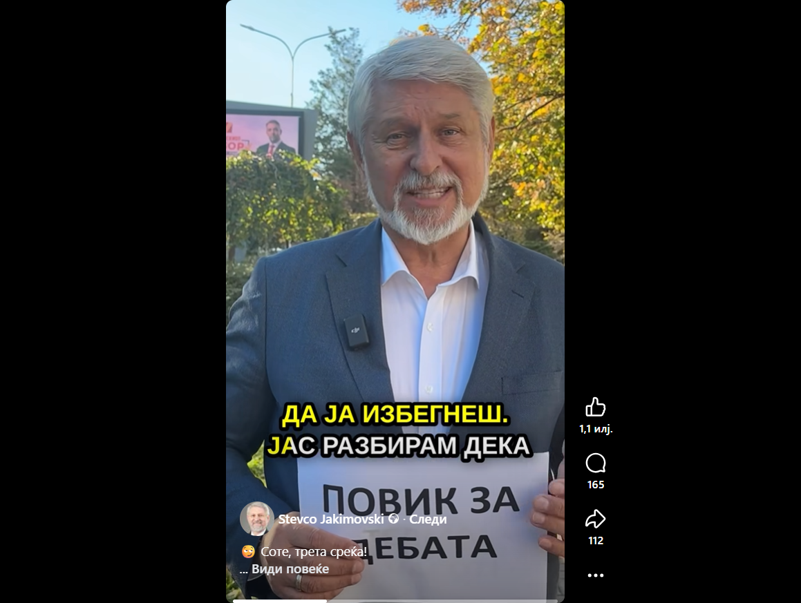 Со ироничен тон, тој му порача на својот противкандидат дека, доколку има страв да настапи сам, може да ја донесе и целата партиска екипа. „Ако и овојпат се плашиш – повикај го ‘родителот старател’ Мицкоски, а можеш да си донесеш и цел кабинет – и Тошковски, и Николовски, и Муцунски, и министерката за финансии – нека ве има на купче. Ќе одиграме симултанка – вие сите со празни ветувања, јас со реални проекти,“ порача Јакимовски.