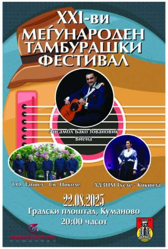 Дваесет и првото издание на музичкиот настан “Куманово 2025” – Меѓународен тамбурашки фестивал, ќе се одржи на кумановскиот градски плоштад, на 22 август (петок), во организација на Фондацијата за култура и спорт – Куманово, под покровителство на Градоначалникот и Советот на Општината.