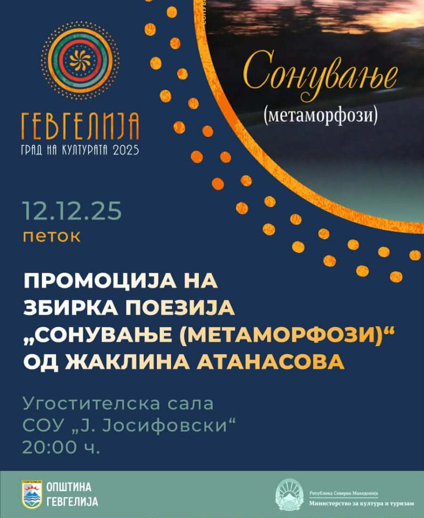 Во рамките на годинешната културна програма „Гевгелија град на културата за 2025 година“, на 12 декември 2025 година (петок), со почеток во 20:00 часот, во Угостителската сала на СОУ „Јосиф Јосифовски“ ќе се одржи промоцијата на збирката поезија „Сонување (Метаморфози)“ од роднокрајната авторка Жаклина Атанасова. Атанасова е професор по Македонски јазик и литература во истото училиште, како и лектор по македонски јазик, а новото дело претставува значајно поетско надополнување на современата локална книжевна сцена.
