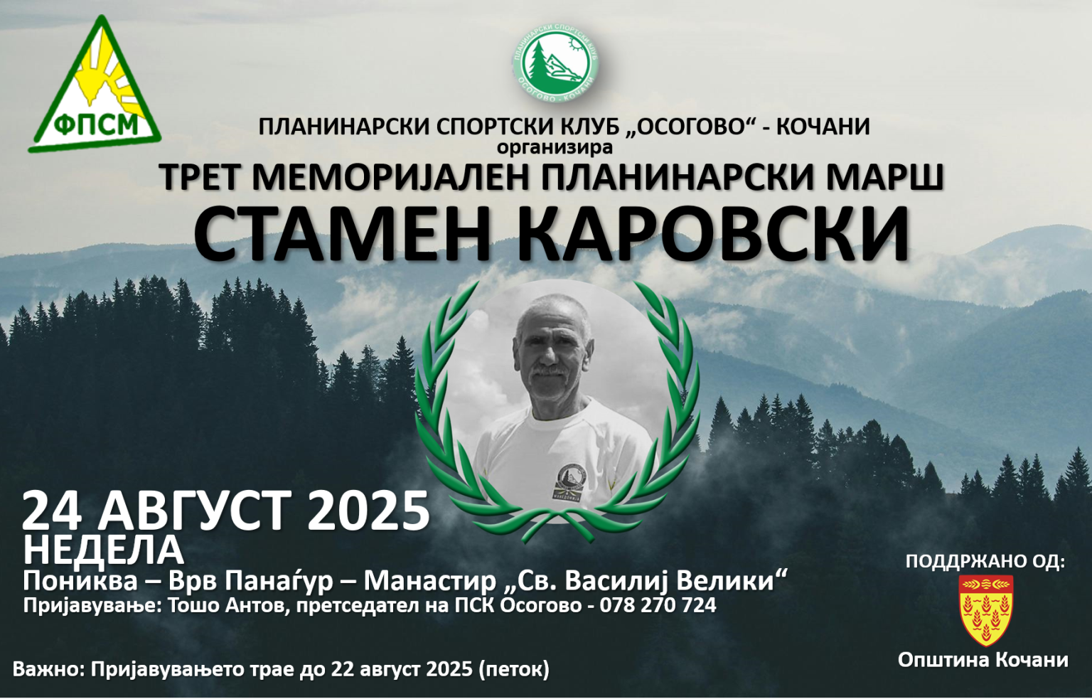 В недела, 24 август 2025 година, Планинарскиот спортски клуб „Осогово“ од Кочани, во соработка со Општина Кочани, го организира третиот Меморијален планинарски марш „Стамен Каровски“, во сеќавање на својот починат член, планинар и другар.
