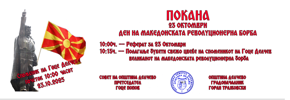 Општина Делчево организира пригодна свеченост во чест на 23 Октомври – Ден на македонската револуционерна борба. Настанот ќе се одржи на 23 октомври (среда) во 10:00 ч пред споменикот на Гоце Делчев во центарот на градот, каде ќе се положи свежо цвеќе.