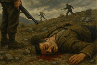 решение како да излеземе од обрачот, бидејќи не би можеле да издржиме до другиот ден. Паднаа многу предлози за излез, едниот беше да избегаме низ шумата преку селото за Елово. Командaнтот Калко реши да поминиме низ теснината на местото Порта. Тргнавме полека, еден по еден и кога се наближивме до Порта, падна наредба да си ги собуеме чевлите и да ги обесиме на вратот. И така поминавме во непосредна близина на бурандарите кои не не открија. Кога стигнавме надвор од обрачот, си ги обувме чевлите и патот го продолживме кон селото Вишени. Надвор од селото се судривме со една мала група грчка војници во заседа. Тие ни викнаа: “Стој“, а ние им одговоривме со “Ура“. Тие се исплашија и веднаш избегаа, дури и не видовме каде. Со марш продолживме над селото Жервени, под селото Коломлати, покрај Статица, над Псодери на Бигла и стигнавме во Буфската Планина, кај местото Јачменчето. Ние решивме тука да останеме подолго. Се поврзавме со младинската организација на Буф, која беше многу јака и набрзо ни донесоа јадење. Јас заминав со ранетите за Битола, бидејќи ја вршев курирската работа за Вичо – Битола.