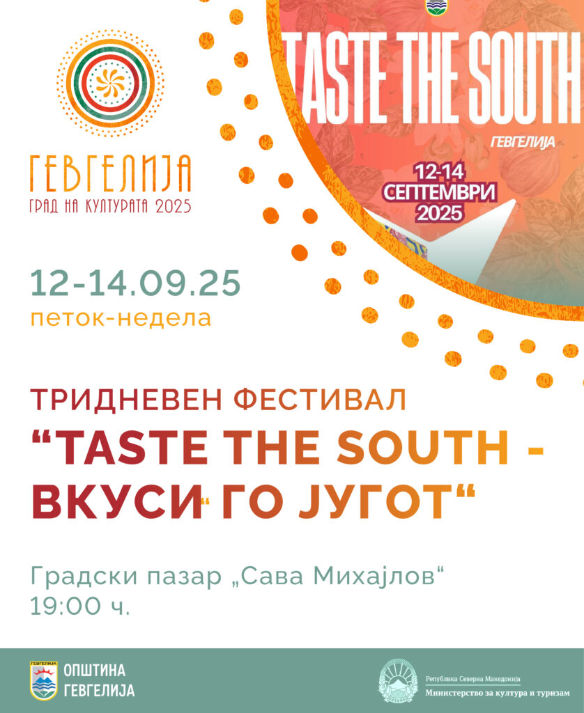 Од 12 до 14 септември 2025 година, Гевгелија ќе биде домаќин на третото издание на Фестивалот „Вкуси го југот“ (Taste the south). Традиционална културно-забавна манифестација за промоција на Гевгелија, која не е само обичен тридневен музички хепенинг, туку претставува своевидна фузија на традицијата, културата и забавата и тоа во повеќе сегменти. Годинава, Фестивалот е дел од програмата за „Гевгелија град на култура“.