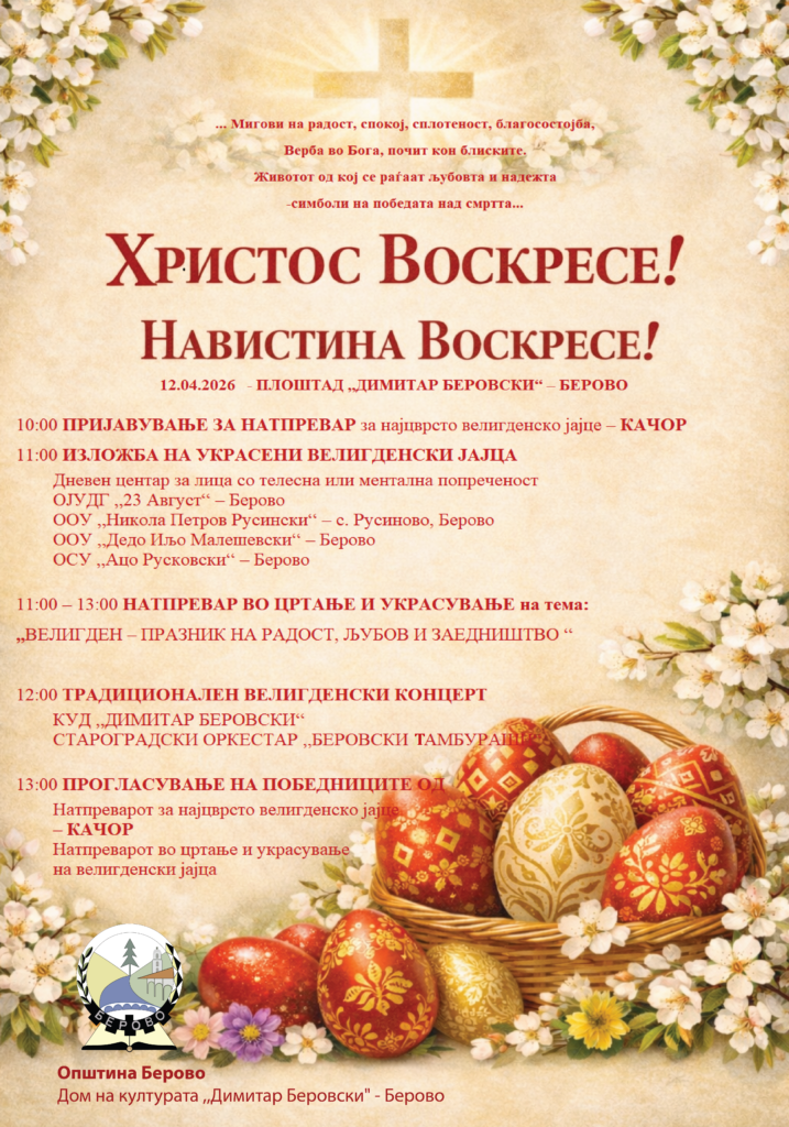 Општина Берово со радост Ве поканува да се придружите на најзначајниот христијански празник – Велигден, кој ќе се одбележи на плоштадот „Димитар Беровски“ на 12 април 2026 година, во недела. Овој ден е посветен на споделување на насмевки, детска игра и топлина, создавајќи незаборавно празнично доживување.
