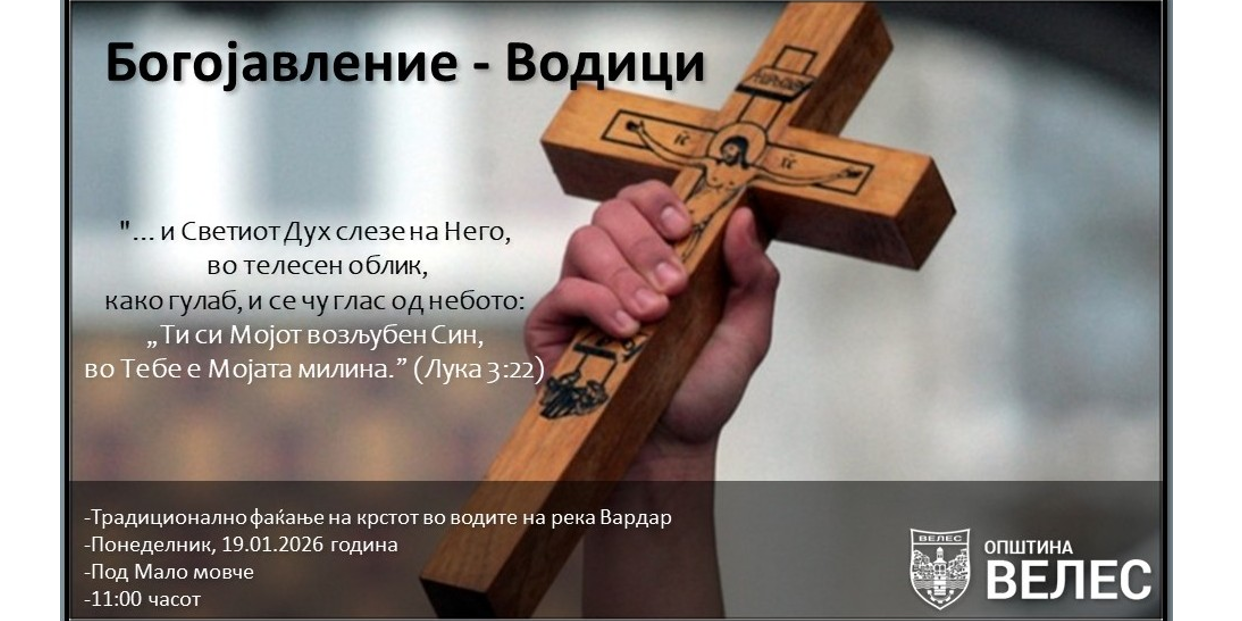 Во пресрет на големиот христијански празник Богојавление Водици, Општина Велес ги повикува сите заинтересирани православни христијани кои сакаат да учествуваат на традиционалното фаќање на светиот крст од водите на река Вардар, да се пријават во просториите на Повардарската епархија денеска до 16:00 часот.